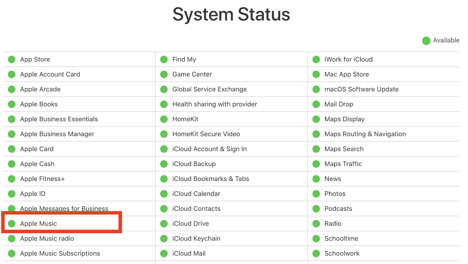 Pour tous les services qui se connectent à l’un des serveurs d’Apple, la première chose que vous devez faire chaque fois que vous rencontrez l’erreur à accomplir ou toute autre erreur connexe est de vérifier Page d’état du système d’Apple. Cette page est mise à jour en temps réel et vous donne l’état des serveurs, des logiciels et d’autres services en ligne d’Apple. Une icône d’état vert à côté de l’élément particulier signifie que l’élément fonctionne bien et n’a pas de pannes ou de temps d’arrêt signalés. Donc, si vous trouvez la musique Apple avec un statut vert, il est temps de passer à la prochaine correction possible.
