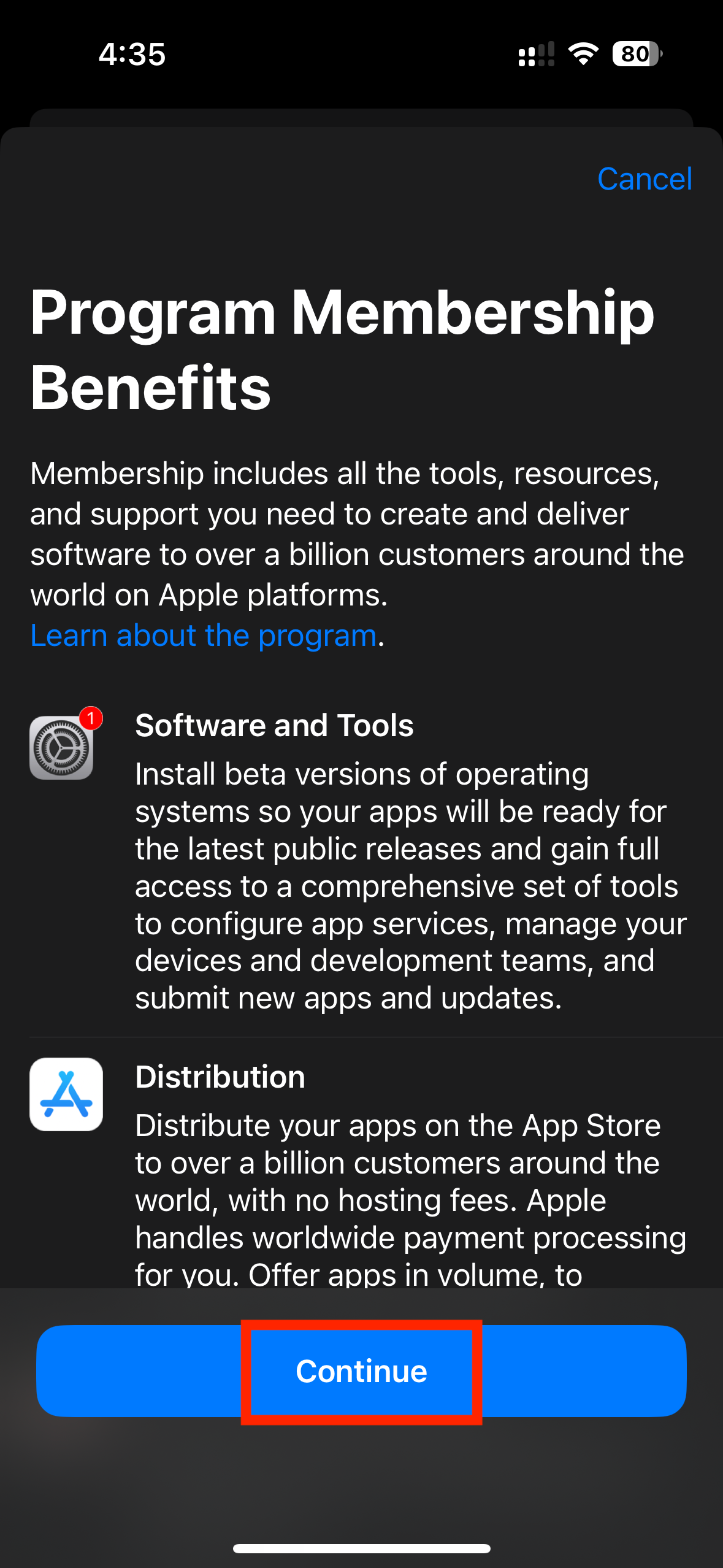 - Sélectionner Continuer à partir de l’écran des avantages sociaux du programme.