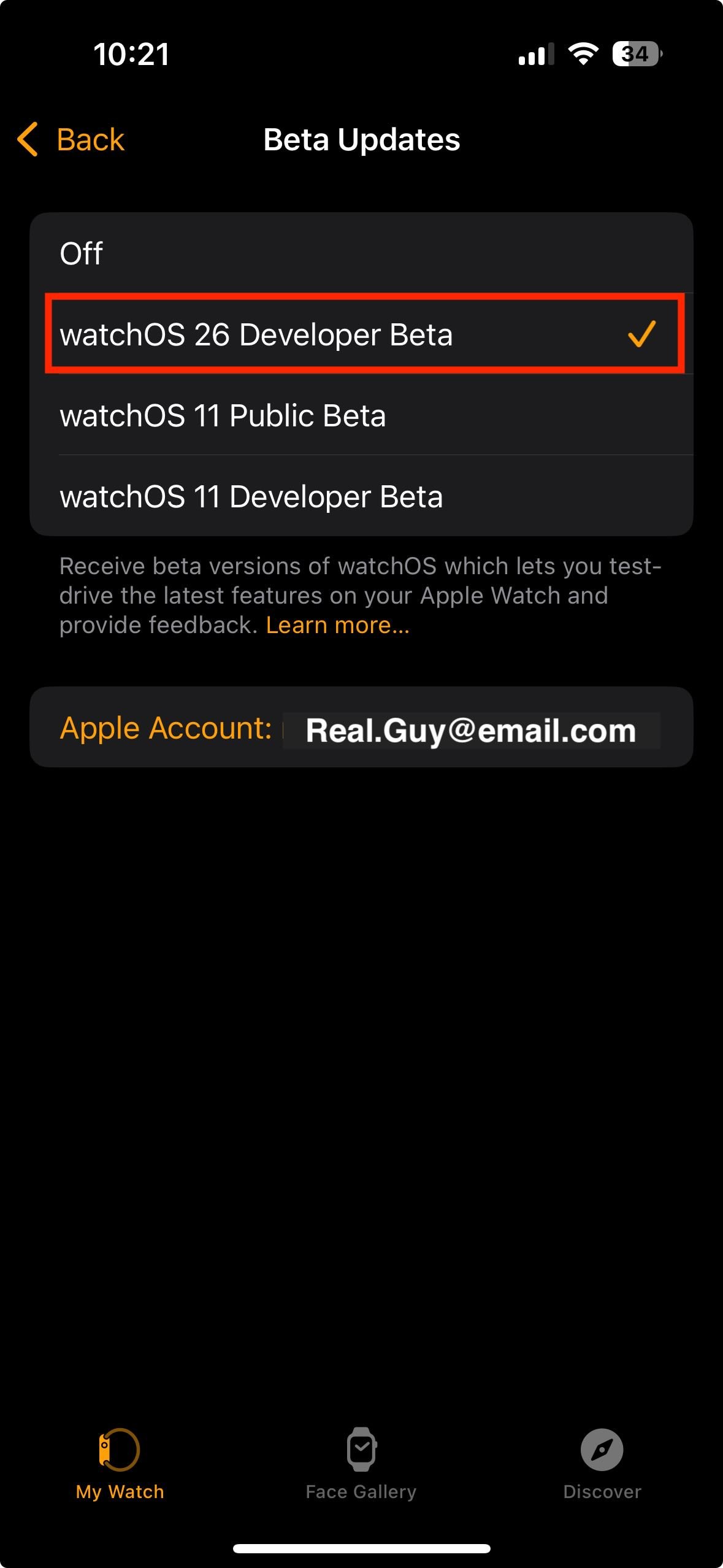 - Choisir Mises à jour bêta et sélectionner Watchos 26 Developer Beta.