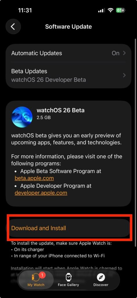 L’inscription à la version bêta du développeur est facile. Il en va de même pour l’installation de WatchOS 26. Vérifiez votre compatibilité ici, puis suivez ces étapes: