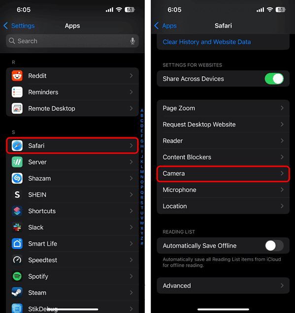 3. Sélectionner SafariFaites défiler vers le bas et tapez Caméra.