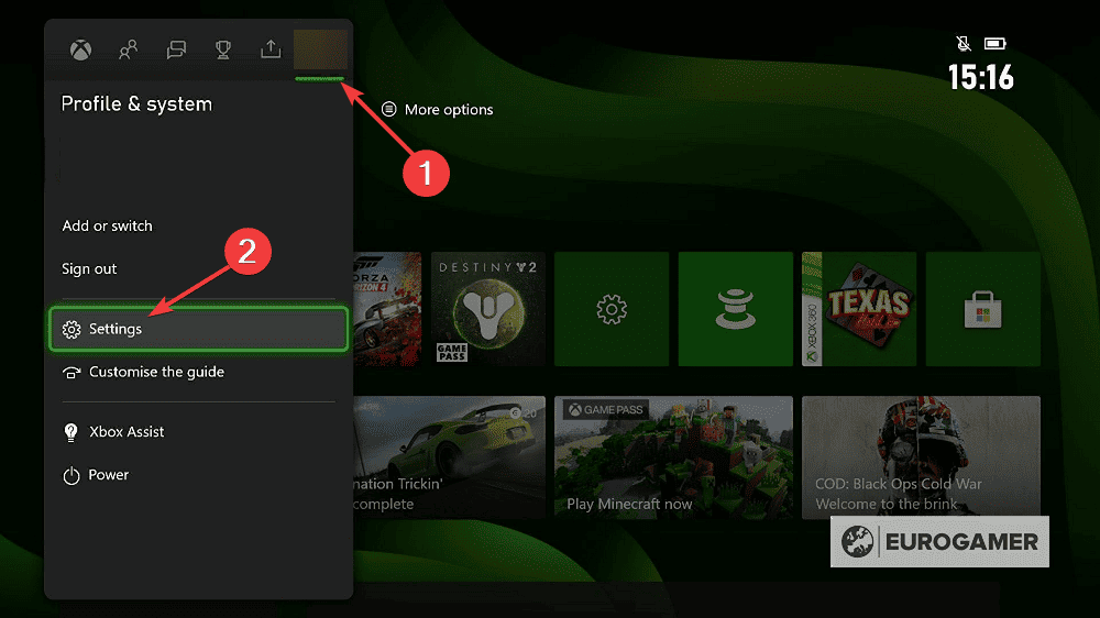 - Ensuite, appuyez sur le Bouton Xbox sur votre contrôleur et naviguer vers Profil et système > Paramètres.