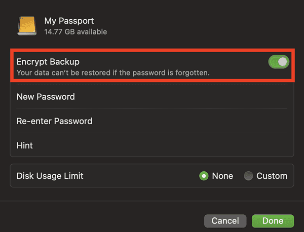 4. Sélectionnez le stockage externe, puis cliquez sur Crypte sauvegarde et Utiliser le disque.