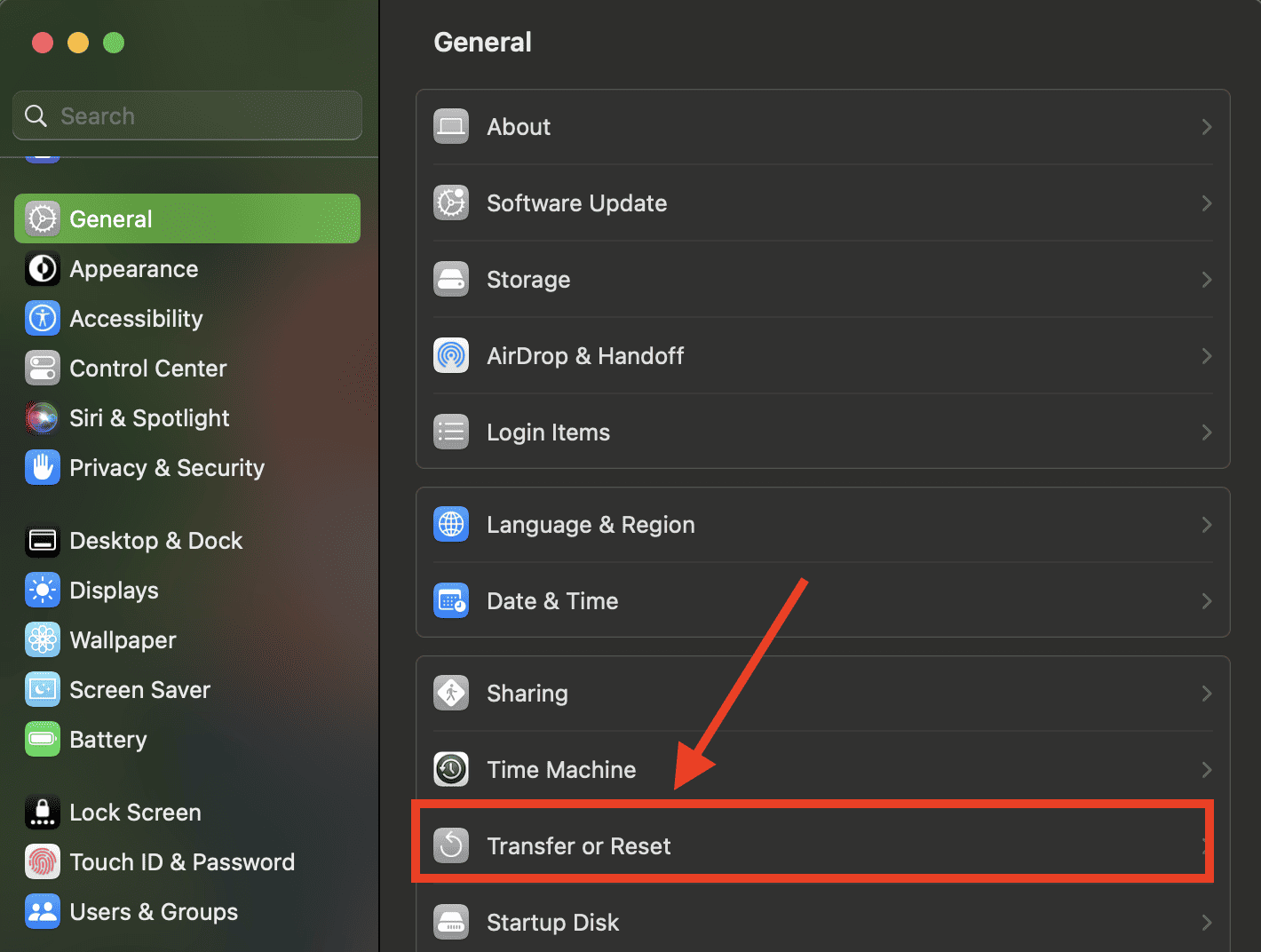 2. Faire un clic Général> Transfert ou réinitialisation.