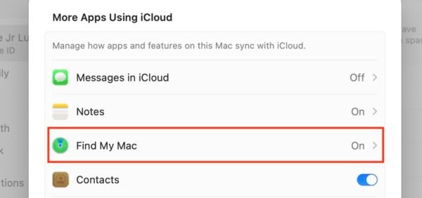 - Sélectionner Trouver mon mac > Allumer et entrez les informations d’identification de connexion de votre profil administrateur. Si tu ne vois pas Trouver mon maccherchez-le dans Montrez plus d’applications… sous Applications utilisant iCloud.