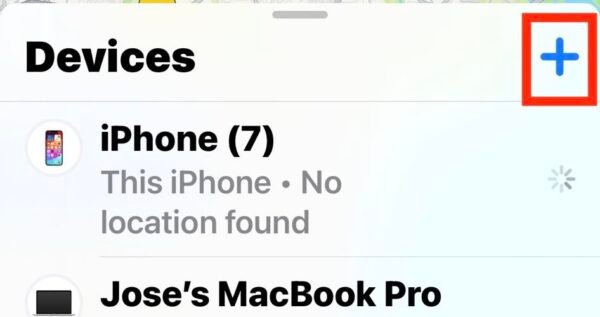 - Ouvrir Trouver mon sur votre iPhone ou iPad> Dispositifs et appuyez sur le Plus symbole (+) sur le côté droit de l’écran.