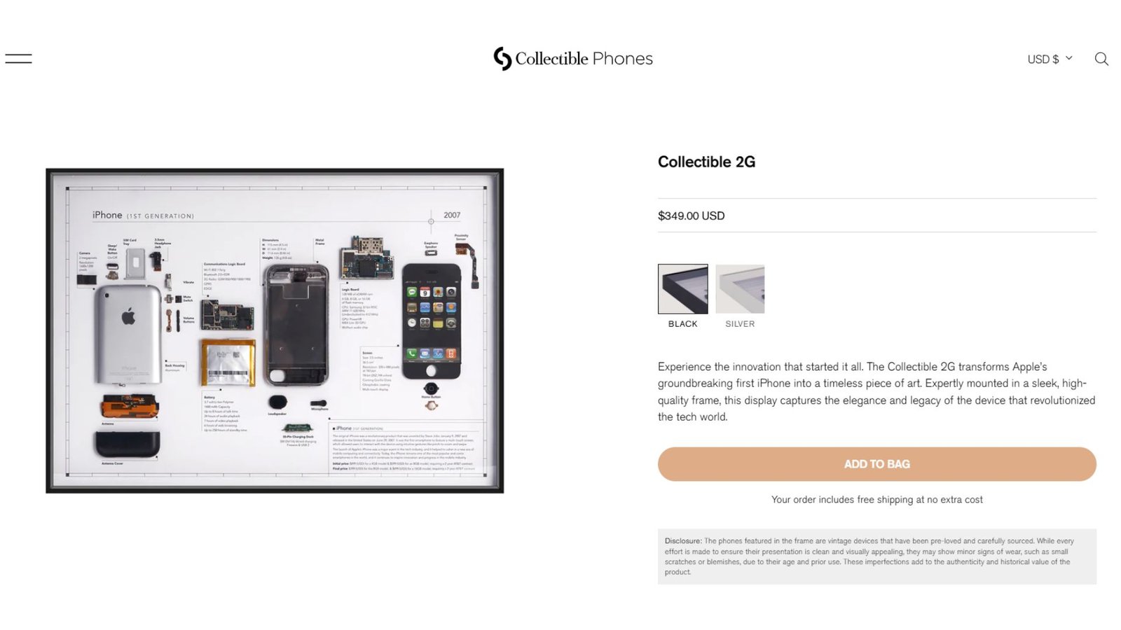 La première édition de la série s’appelle Collecble 2G. Chaque pièce contient des composants soigneusement provenant et conservés à partir d’un iPhone d’origine. L’écran, la carte logique, la batterie et d’autres pièces sont étiquetées et affichées dans un cadre de 30 cm par 42,3 cm. Les acheteurs peuvent choisir une finition noire ou en argent, et le prix est de 349 $, y compris l’expédition mondiale.