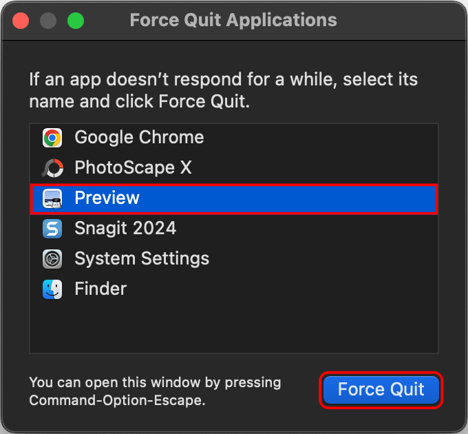 - Sélectionner Prévisualisation à partir de la liste des applications et frappez Force quitter.
