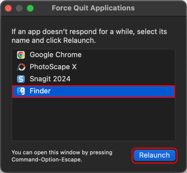 - Sélectionner Chercheur à partir de la liste des applications et frappez Relancer.