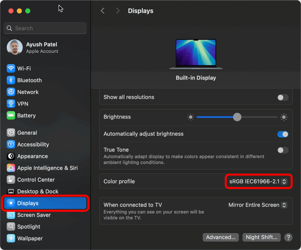 - Aller à Afficher et ouvrez le menu déroulant à côté de Couleur Profil.