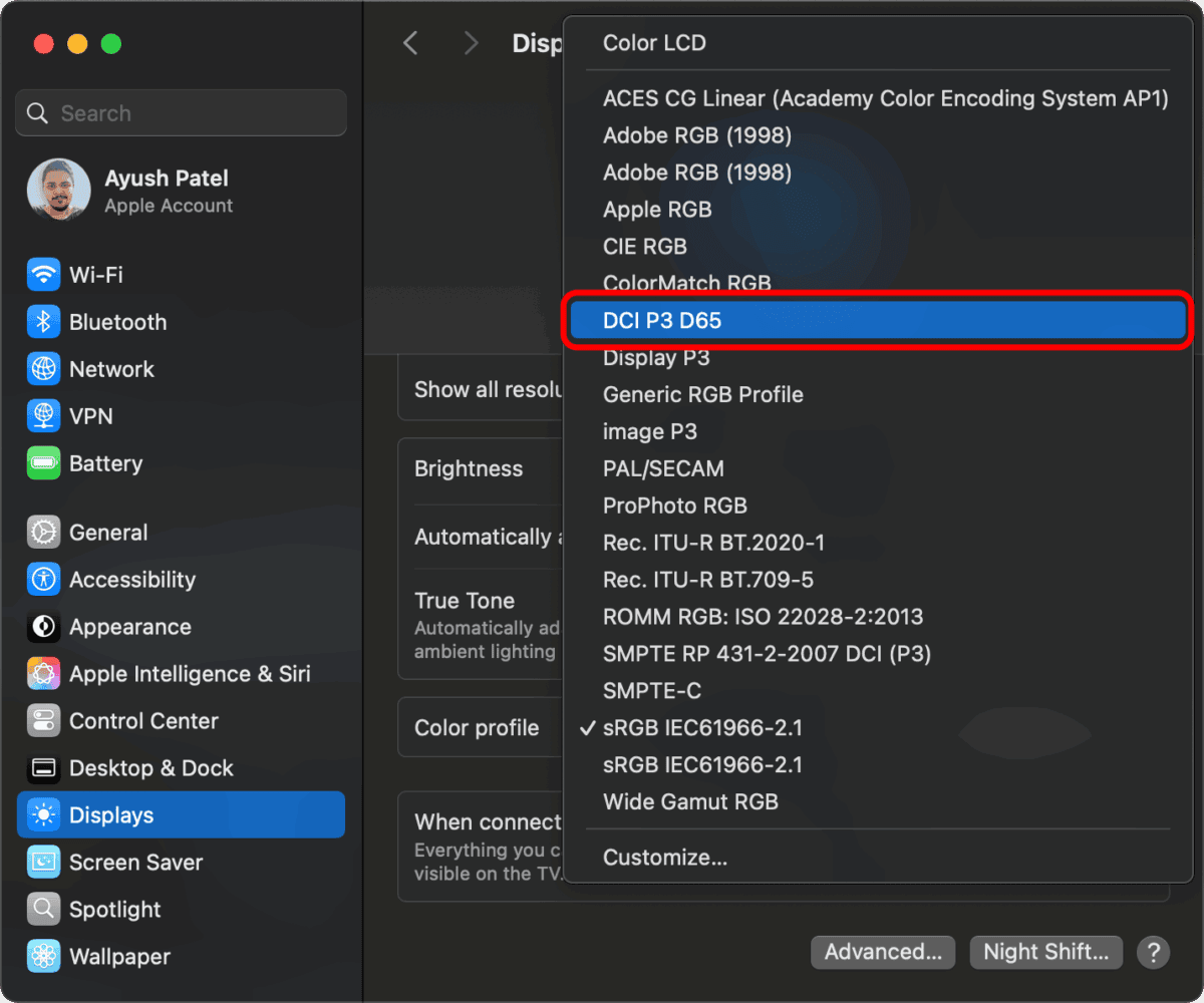- Localiser et sélectionner le Photographie (P3-D65) profil de couleur. Alors, redémarrage Votre Mac.