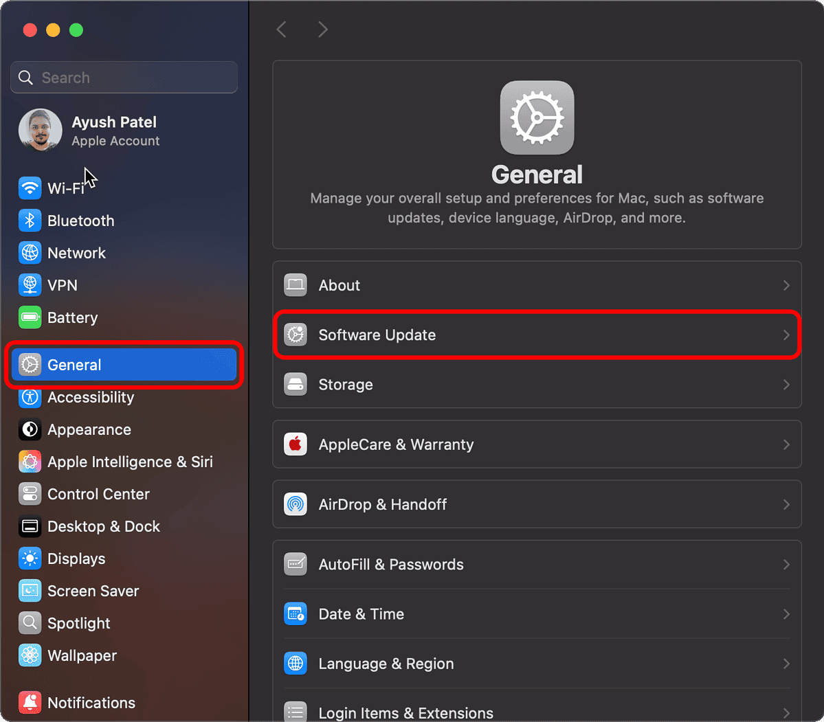 - Se diriger vers Général dans la barre latérale et sélectionner Mise à jour logicielle.