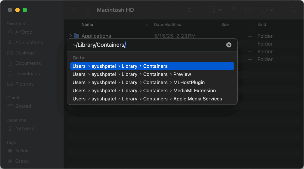 ~~/Library/Containers/dans la boîte de recherche et appuyer Retour.