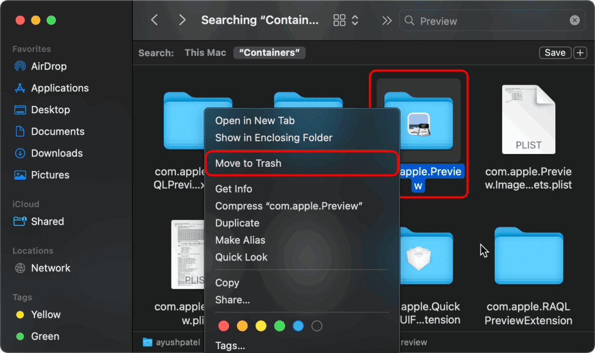 - Cliquez avec le bouton droit sur com.apple.preview et sélectionner Passer à la poubelle.