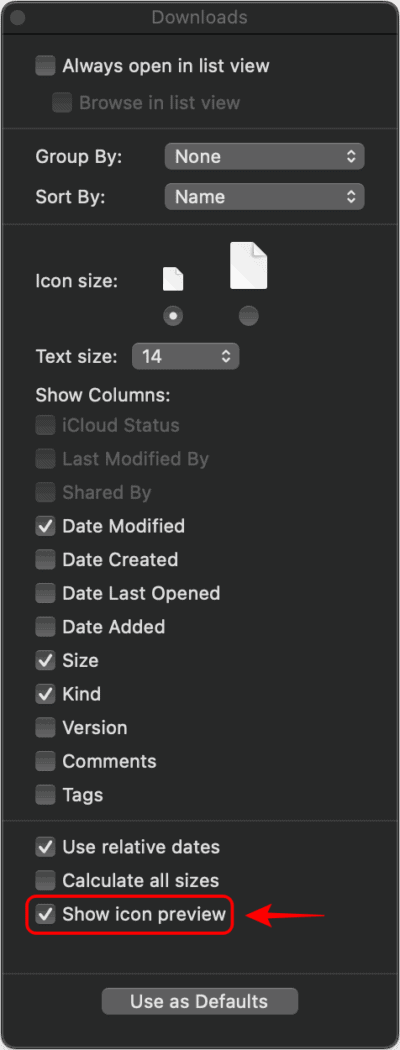 Si vous rencontrez des problèmes visualisant les vignettes de l’image dans Finder, c’est peut-être parce que vous n’avez pas configuré les choses correctement. Pour afficher les vignettes de l’image, vous devez activer Afficher l’icône Aperçu dans les options de vue de Finder.