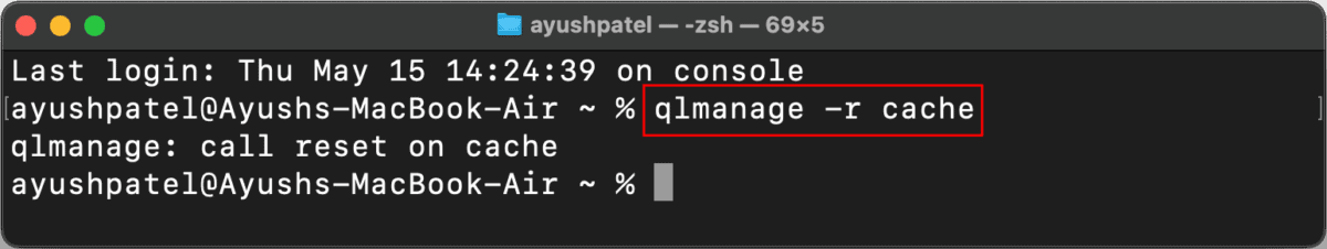 qlmanage -r cachedans la fenêtre du terminal et appuyer Retour.