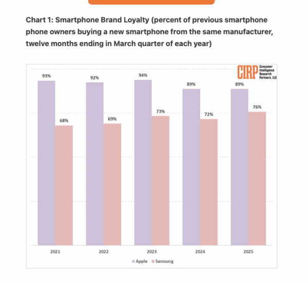 Selon Consumer Intelligence Research Partners (CIRP), Apple détient toujours une solide avance, mais l’élan a changé. Alors que l’écosystème d’Apple continue de garder de nombreux utilisateurs enfermés, plusieurs facteurs tels que les prix, la compatibilité de la messagerie et la saturation du marché ont affaibli la prise. Samsung, en revanche, bénéficie d’une concurrence réduite et d’améliorations progressives de sa rétention des utilisateurs.