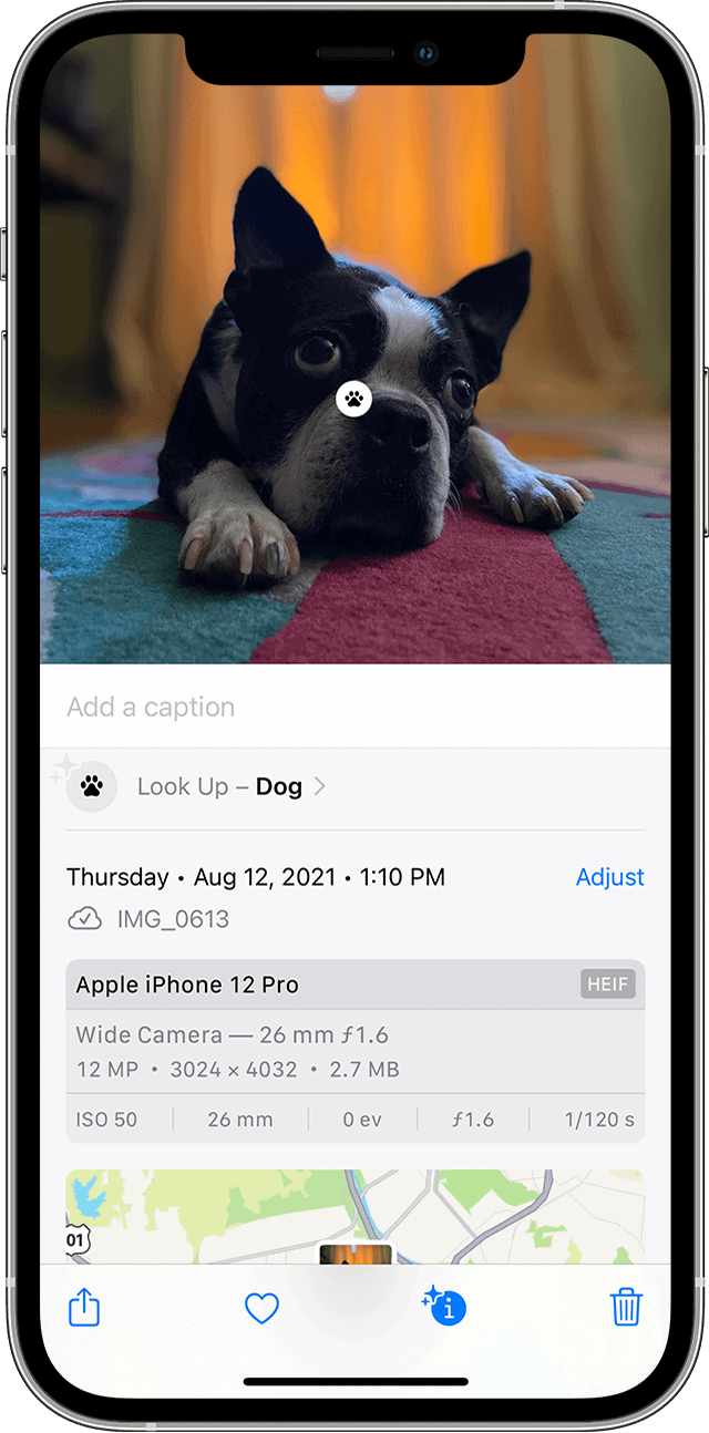 Recherchez un icône scintillante Sur le bouton Info (ⓘ) ou balayez sur une photo pour voir si la recherche visuelle est disponible.