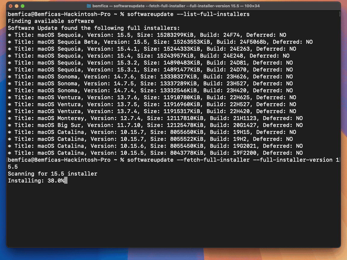 softwareupdate --list-full-installers - Cela renverra une liste des installateurs de macOS. Prenez note du numéro de version, plus récent ou plus ancien, le plus proche de celui de votre programme d’installation de buggy.