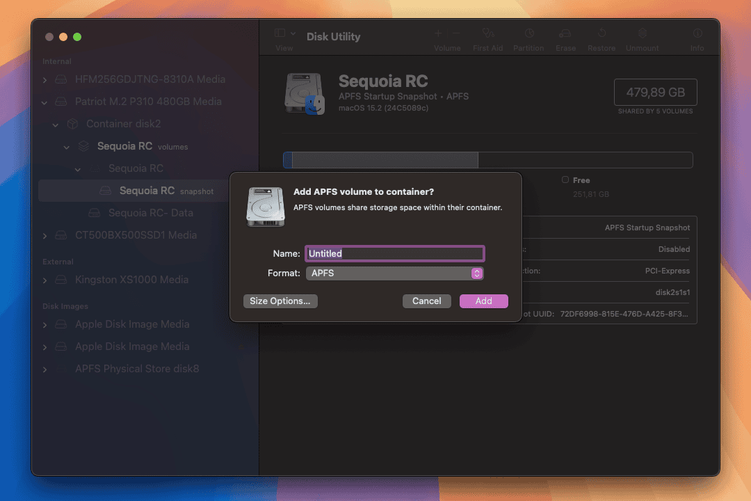 Une méthode que je trouve particulièrement utile est le partitionnement de votre disque interne, l’installation de la nouvelle macOS, puis la restauration de vos données. Cela aide non seulement si vous ne pouvez pas installer MacOS Sequoia sur votre Mac, mais empêche également la perte de données lors des mises à niveau. Une chose à considérer est que vous devez avoir au moins la moitié de votre stockage gratuit pour utiliser cette méthode.